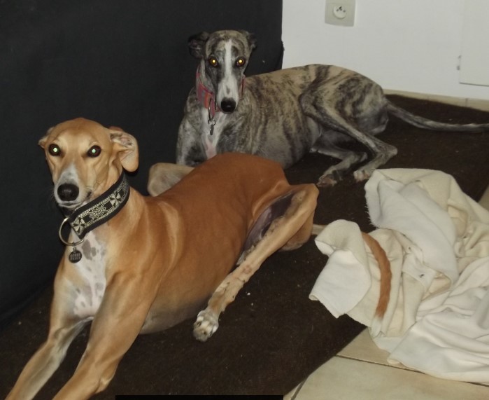 Puis en 2014 nous avons adopté notre 2e galgo, ASLAN un grand timide tout cassé. LONA l’a donc guidé et lorsque ce grand gaillard a compris qu’il était aimé et que plus rien ne lui arriverait il est devenu un vrai pot de colle, une glu sans cesse en quête de câlins, de contacts.